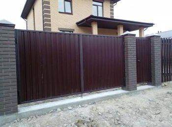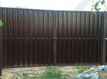 Любое ограждение должно иметь удобный и безопасный въезд для транспорта. Если территория – просторная, то можно купить распашные ворота, которые представляют конструкцию с двумя створками, открывающимися вперед. Устанавливают их на опорных столбах, для заполнения каркаса используется профнастил, сетка или металлический штакетник.
